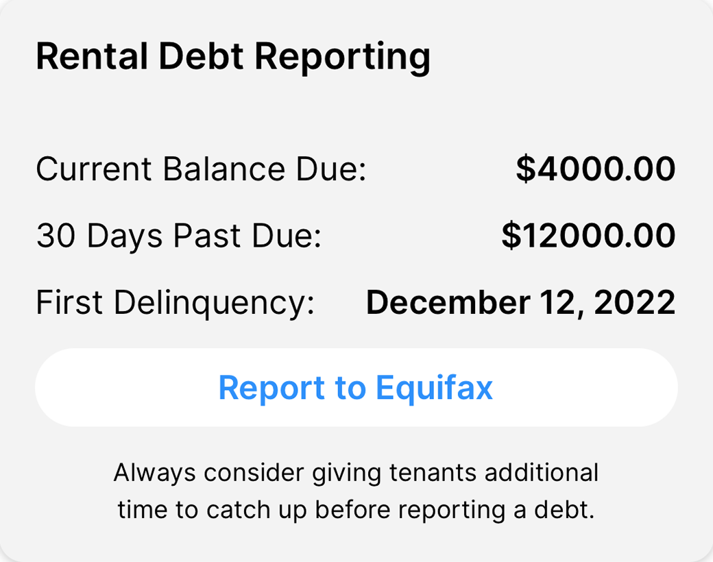 3) Report unpaid rent to Equifax — Once rent is overdue by 30+ days, you’ll have the option to report it directly to Equifax — holding tenants accountable.