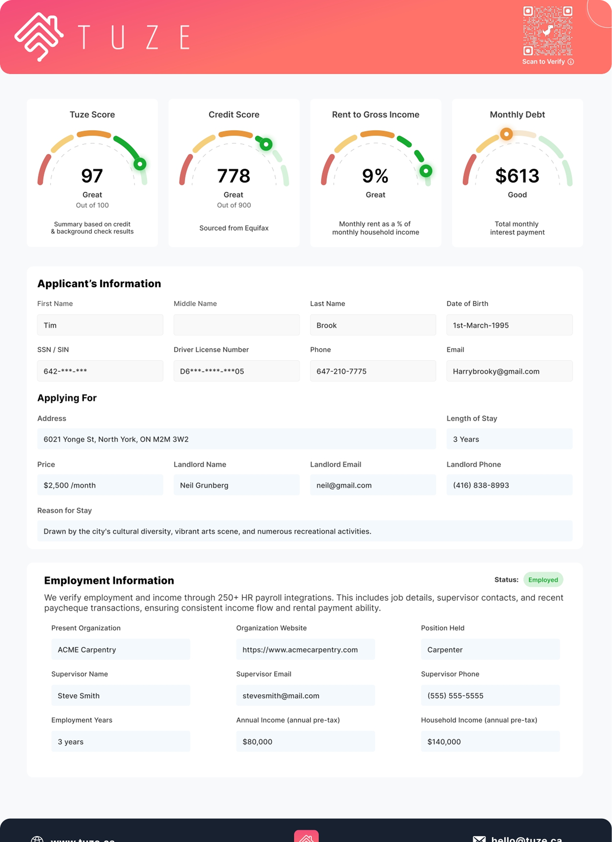 We run a soft credit check with Equifax for a full credit report without an impact on the tenant’s score — and verify ID against authoritative databases and issuing sources.